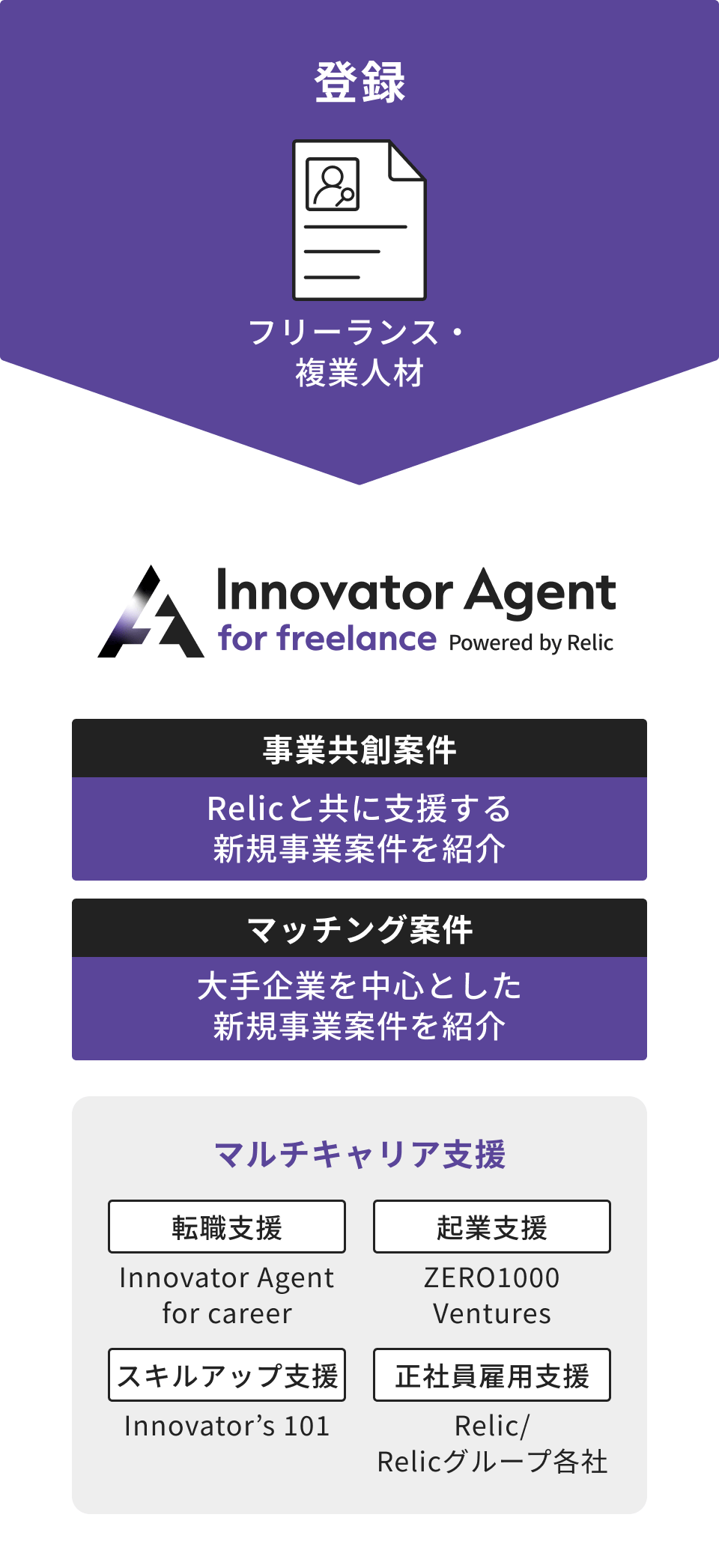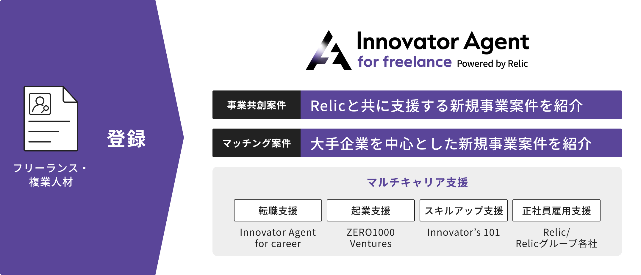 共創機会・案件の紹介以外にも、「転職支援(Innovator Agent for career)」「起業支援(ZERO1000 Ventures)」「スキルアップ支援(Innovators’101)」「正社員雇用(Relic / Relicグループ企業)」など、キャリア目標に合わせた多様なご支援を提供しています。
