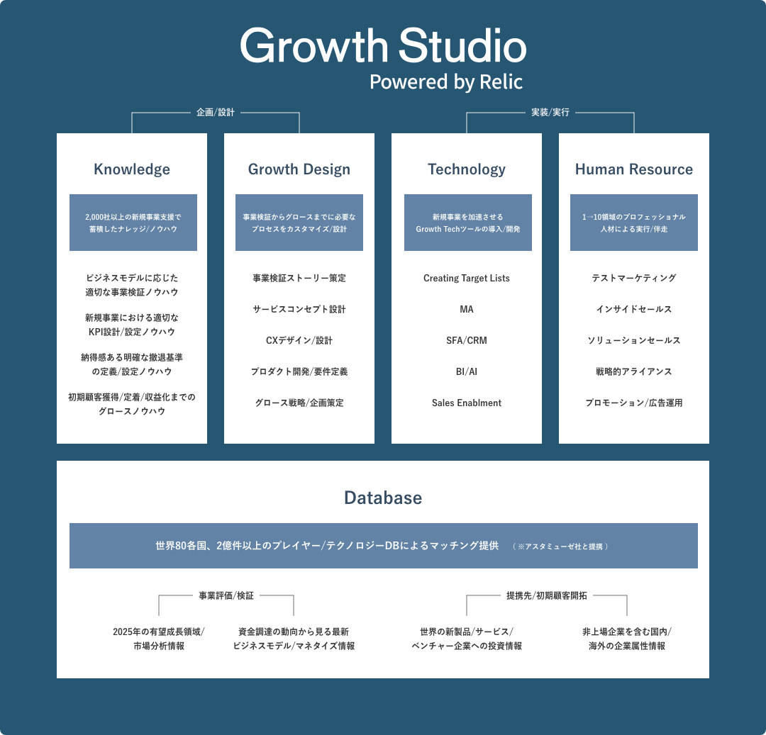 新規事業の事業性の検証から成長・拡大(1→10や10→100)において必要な「ナレッジ」 「テクノロジー」「データベース」「ヒューマンリソース」 「グロースデザイン」の提供を通じて、KGI/KPIを達成するためのグロース戦略や具体的な戦術・施策のプランニング、実行/運用~体制構築までを一気通貫してサポートいたします。