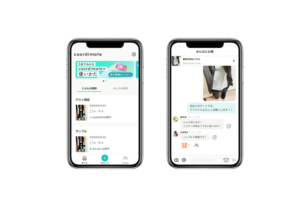 「coordimate」は「この服アリ?ナシ?」のリアルな声がサクッと聞けちゃうファッション相談アプリです。相談者は、自身のファッションを「coordimate」に投稿すると、数分で一般女性達(mate)から「アリナシ」のリアクションやアドバイスといったフィードバックをもらえます。