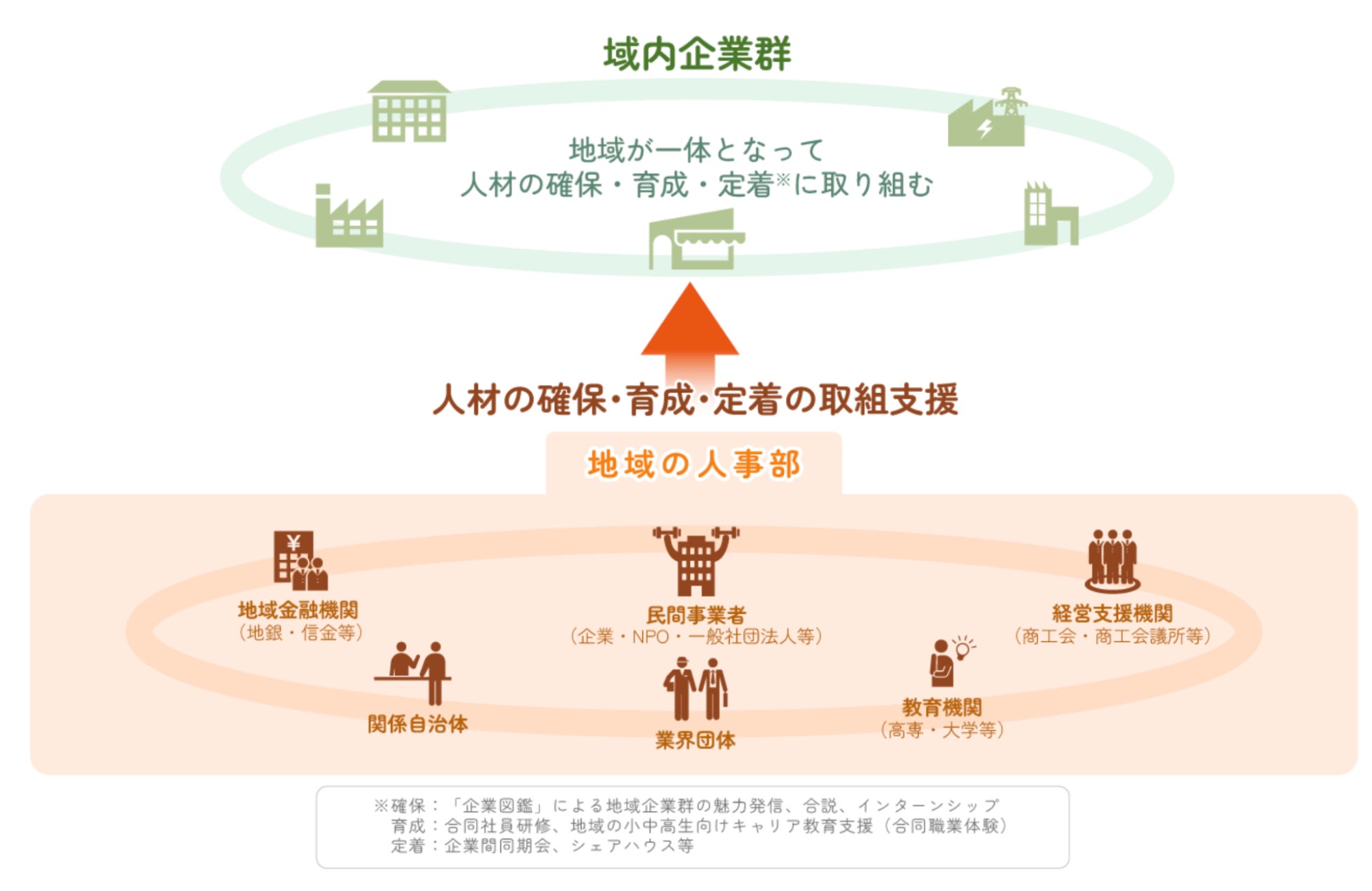 経済産業省 経済産業政策局では、民間事業者等が地域の関係機関と連携し、地域一体で人材確保・育成・定着に取り組む「地域の人事部」を推進しています。