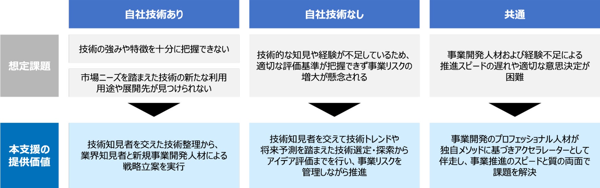 本ソリューションは、例えば下記のようなシーンでの価値提供を想定しています。自社技術の有無を問わず、技術起点での新規事業を開発しようとする企業が抱える課題を幅広く解決することが可能です。多岐にわたるシーンや用途に対して、技術起点の事業開発を戦略と実行の両面から一気通貫で支援します。