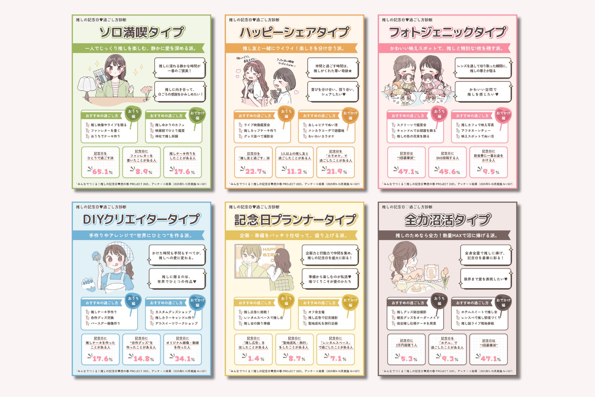 アンケート調査で得られた500名超のリアルな声を分析し、推し活タイプを6つに分類。診断結果に応じて、「ソロ満喫タイプ」「ハッピーシェアタイプ」「フォトジェニックタイプ」「DIYクリエイタータイプ」など、あなたにぴったりの“推しの記念日の過ごし方”を提案します。