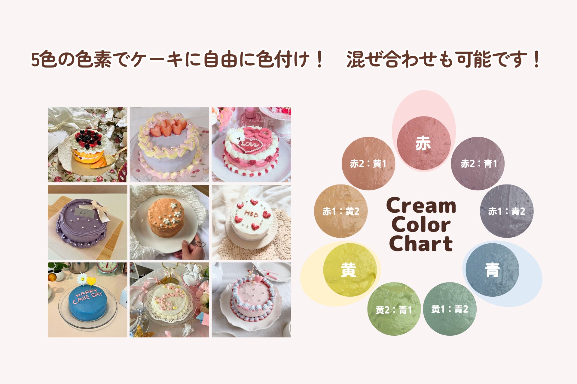 大切な人の好きな色や象徴する色、イベントの世界観にマッチしたデコレーションなど、様々なケーキを紹介しています。