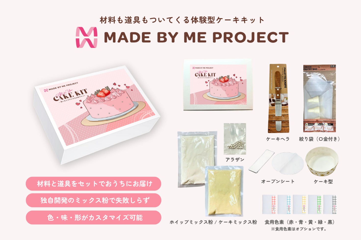 MADE BY ME PROJECTは、お菓子作りで見えない想いをカタチにする体験(トキ)をお届けするプロジェクトです。ベース材料や型紙といった道具類、デコレーション材料をまとめてお届けするので、自宅で準備するものは最小限にし、初心者の方でも簡単に手作りできるお菓子キットです。好きな色、好きな味、好きなデコレーションで、家族や友人、推しといった大切な人への想いをカタチにすることができます。