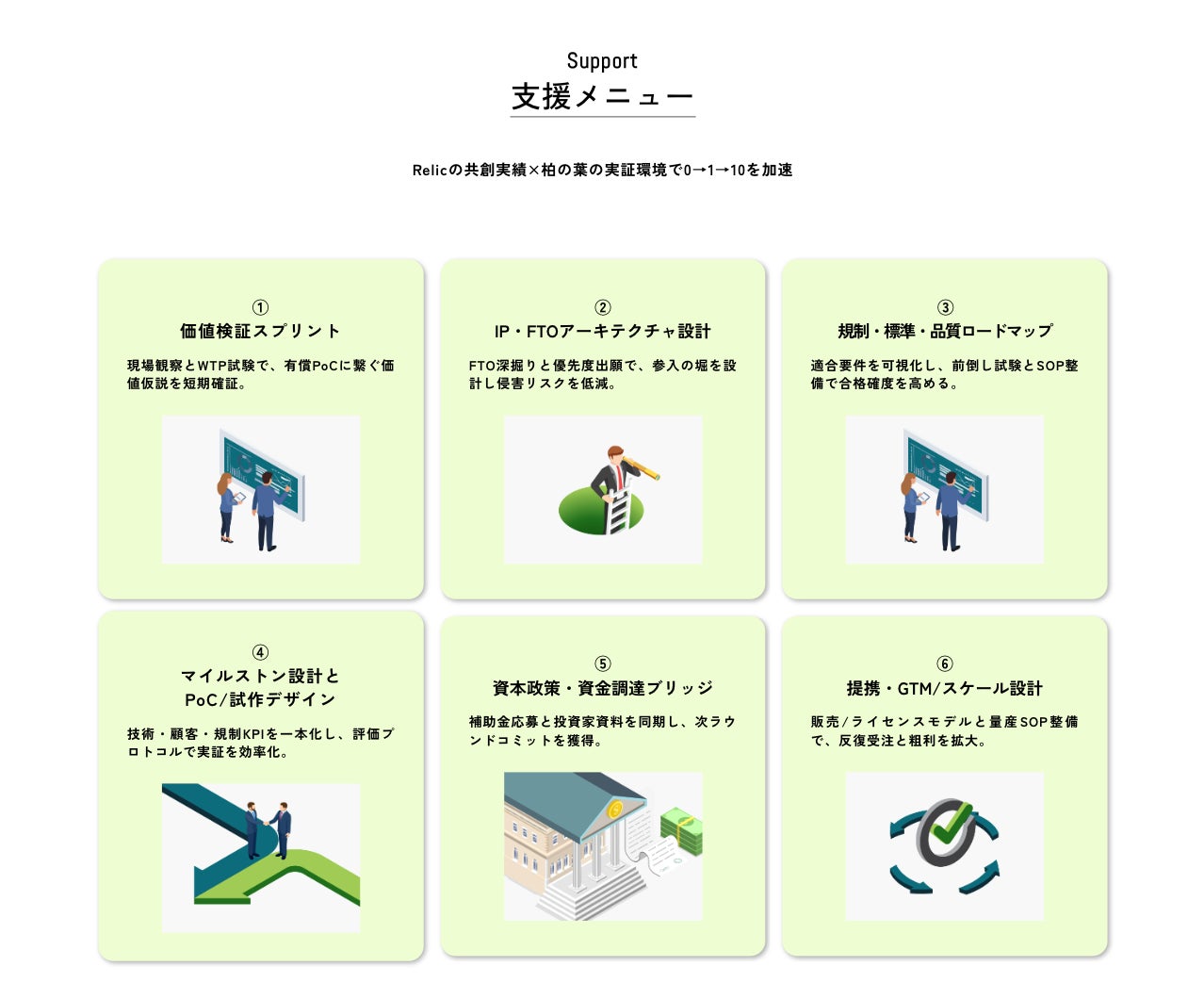 「ZERO1000 Ventures for Kashiwanoha」は、千葉県柏市「柏の葉スマートシティ」を舞台に、これまで5,000社以上の新規事業開発を行ってきたRelicグループのアセットを活用しながら、スタートアップとしての事業開発に挑戦するプログラムを提供します。本プログラムでは幅広い事業アイデアを募集しており、ディープテック領域では同分野を専門に事業開発支援を行うディープテックイノベーションセンターのメンバーが伴走するなど、各領域ごとに伴走支援を行います。